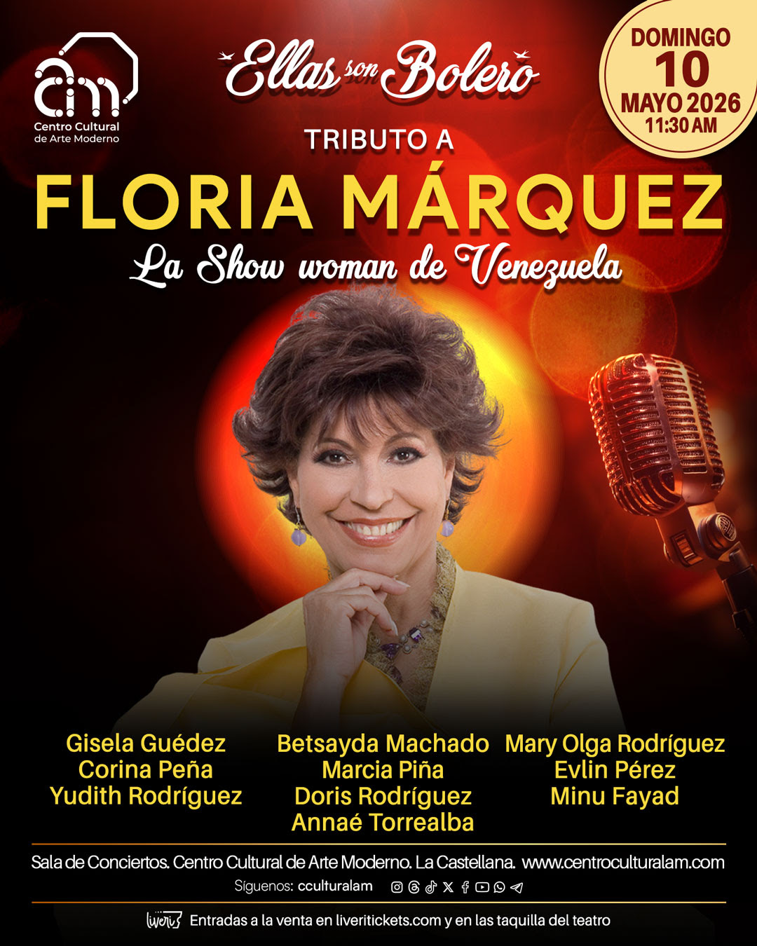 Las entradas para esta función única de Ellas son bolero: Tributo a Floria Márquez, regalo perfecto para las madres y para todo aquel que disfrute escuchando estos clásicos; ya se encuentran a la venta a través del portal liveritickets.com y en las taquillas de Cinex. También pueden adquirirse en el Centro Cultural de Arte Moderno, en La Castellana, abiertas de jueves a domingo de 11:00 a.m. a 5:00 p.m.