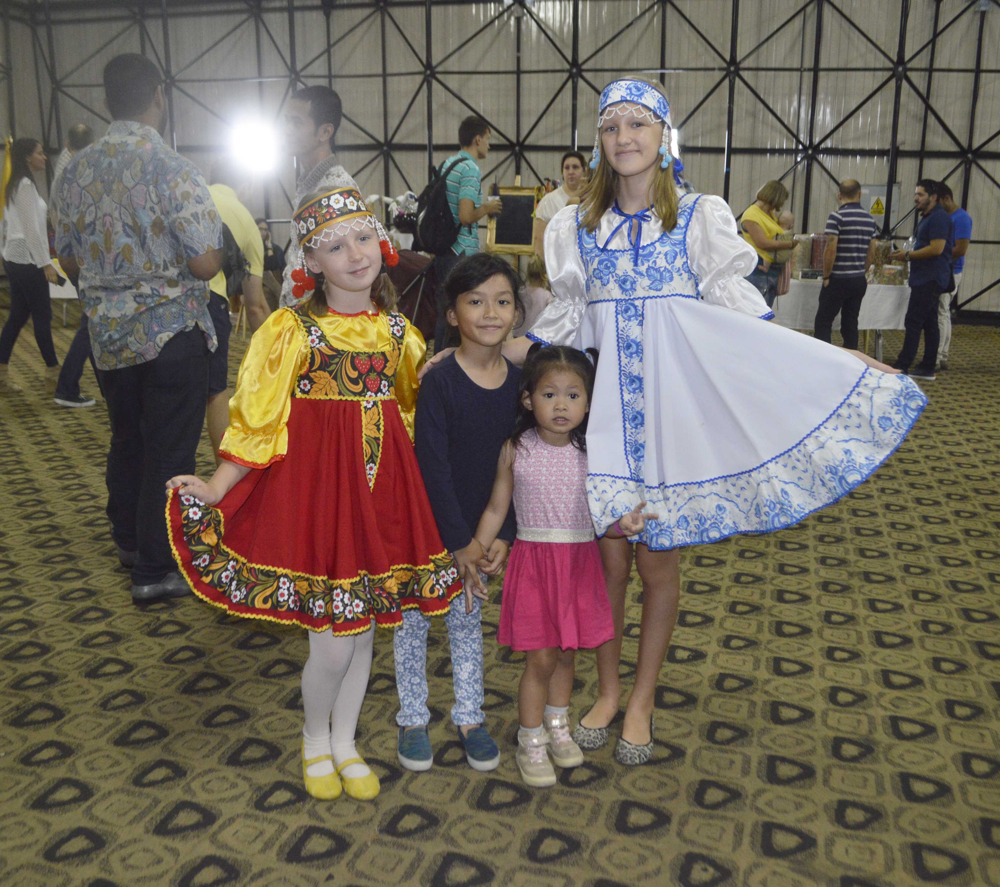 Rusia ofrecía diferentes tipos de vodkas, varios de ellos artesanales, con envases preciosos, las coloridas y bellas matrioskas y otros bellos recuerdos y siempre gentiles allí Oksana Matsenko y las bellas niñas Sofía y Tatiana Matsenko, vestidas con trajes típicos.