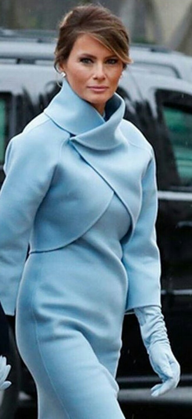 Para su primer día como Primera Dama de los Estados Unidos, Melania Trump escogió un diseño de Ralph Lauren en tono azul pastel, el cual combinó con estiletos y guantes en el mismo color, sellando todo con un elegante recogido.