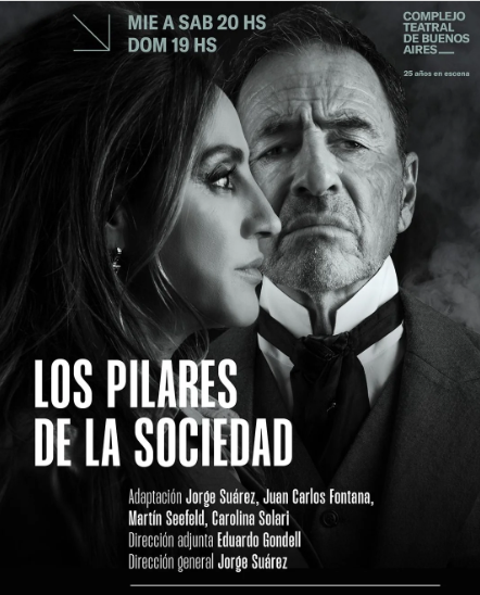 Una de sus obras más desgarradoras “Los Pilares de la Sociedad”, está presentada en Buenos Aires, bajo la experta Dirección General de Jorge Suárez, con la Dirección Adjunta de Eduardo Gondell, en una magistral adaptación del gran actor Martin Seefeld, Juan Carlos Fontana, el mismo Jorge Suárez y la dramaturga y actriz Carolina Solari, logrando una puesta en escena excepcional; entre todos, han convertido este tema dramático e íntimamente cruel, en un evento teatral de primera clase.